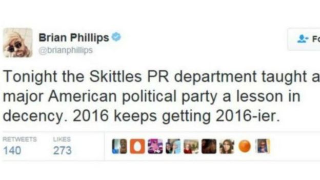 وقال برايان فيليبس: "اليوم قسم العلاقات العامة للسكيتلز لقّن حزبا سياسيا أمريكيا كبيرا درسا في اللياقة."
