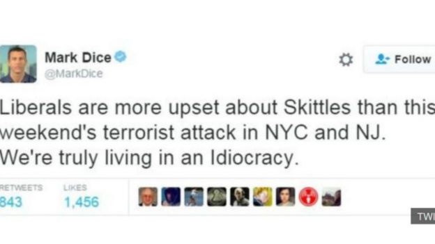 وقال مارك دايس إن "الليبراليين أكثر غضبا بشأن سكيتلز من الهجوم الإرهابي الذي وقع في عطلة نهاية الأسبوع الجاري في مدينة نيويورك ونيو جيرزي."