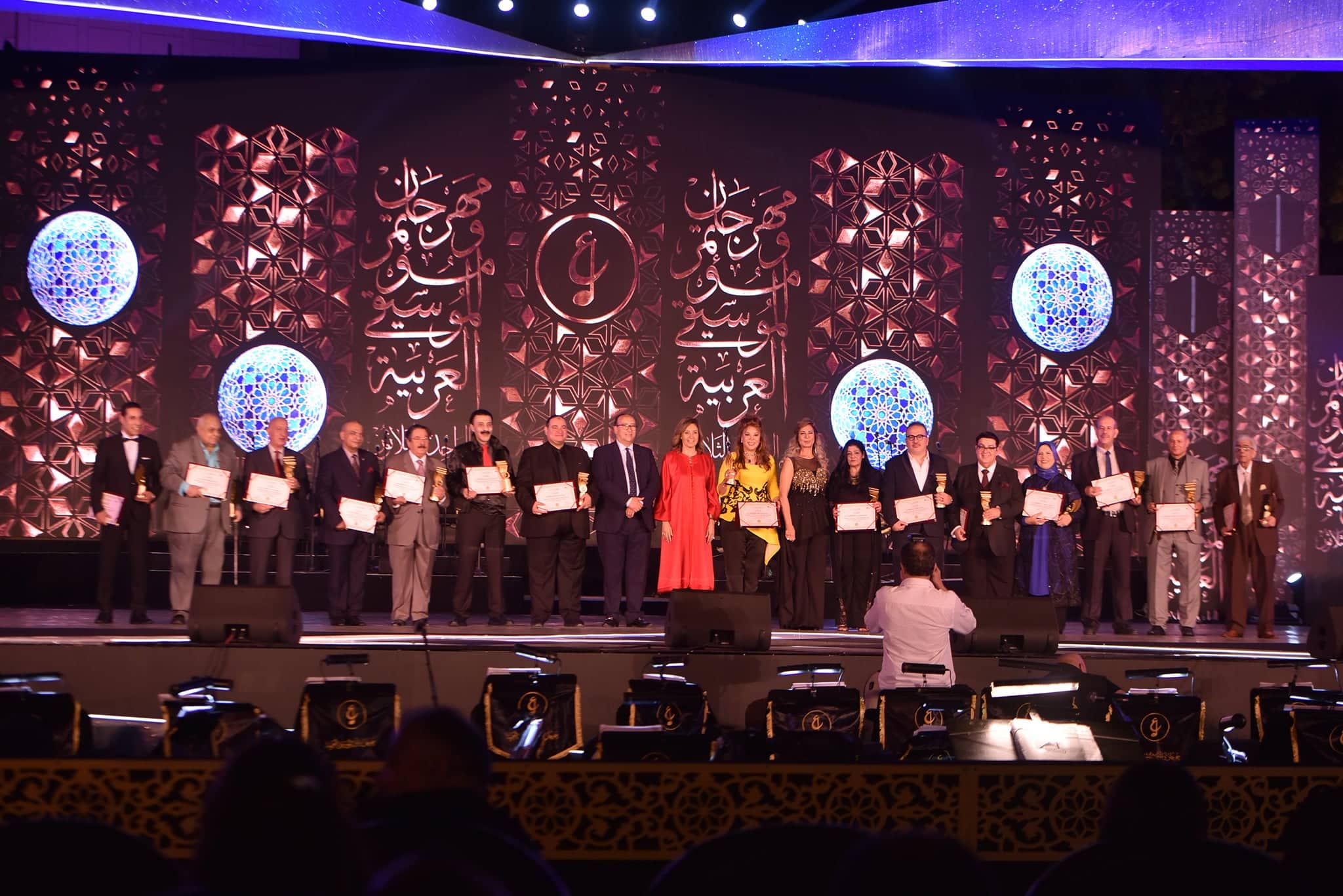 ثم قامت بمصاحبة الدكتور مجدى صابر رئيس الأوبرا وجيهان مرسى مديرة المهرجان بتكريم 16 شخصية ساهمت فى إثراء الحياة الفنية فى مصر والوطن العربى هم اسم الموسيقار الكبير الراحل على إسماعيل وتسلمتها ابنته شجون، واسم المؤرخ والناقد الموسيقى الراحل الدكتور زين نصار عضو اللجنة العلمية لمهرجان ومؤتمر الموسيقى العربية وتسلمها نجله أحمد، الفنان اللبنانى راغب علامة الذى يتسلم التكريم خلال حفله، الشاعر هانى عبدالكريم، الموسيقار مودى اﻹمام، الفنان البحرينى أحمد يوسف الجميرى، الفنان الكويتى يعقوب الخبيزى، الدكتور عاطف إمام أستاذ آلة الناى والعميد الأسبق لمعهد للموسيقى العربية الدكتورة رشا طموم الأستاذ بقسم النظريات والتأليف الموسيقى بكلية التربية الموسيقية جامعة حلوان ورئيس اللجنة العلمية لمهرجان ومؤتمر الموسيقى العربية، الدكتور نبيل الدراس رئيس تحرير مجلة البحث الموسيقى الصادرة عن المجمع العربى للموسيقى التابع لجامعة الدول العربية، الدكتور صالح رضا صالح مصطفى رضا، عازف القانون الدكتور ماجد عسكر، فنان الخط العربى محمد يوسف عبداللطيف المغربى رئيس النقابة الفرعية للخطاطين بالإسكندرية والمشرف الفنى بمدرسة محمد إبراهيم للخط العربى بالإسكندرية، الموسيقار حسين فوزى، شاعر العامية والأديب والسيناريست شوقى حجاب، الفنانة والإعلامية صفاء أبو السعود التى أضفت بهجة كبيرة خلال ظهورها على المسرح وقامت بغناء بعض أعمالها التى عرضت خلال وجودها على المسرح.
