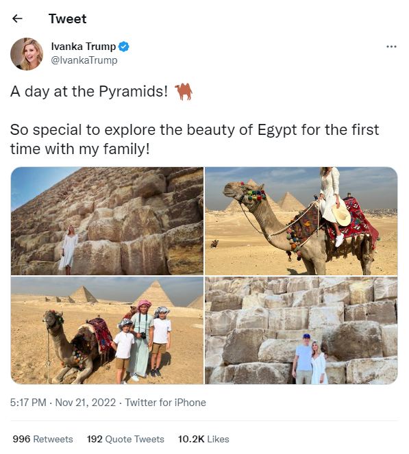 وشاركت إيفانكا متابعيها عبر صفحاتها على مواقع التواصل الاجتماعي، صورا لها مع عائلتها، وكتبت: "يوم مميز لاستكشاف جمال مصر لأول مرة مع عائلتي"، حيث لاقت الصور تفاعل الكثير من المتابعين.