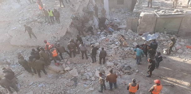 وأفاد المرصد السوري لحقوق الإنسان، بأن المبنى يضم سبع عائلات من نازحي مدينة عفرين وعددهم 30 شخصا ولا يزال الغالبية منهم عالقين تحت الأنقاض.
