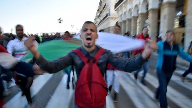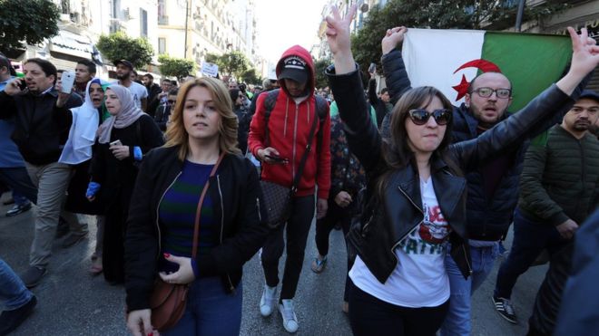 وردد المتظاهرون، وأغلبهم من الشباب، "لا لفترة خامسة"، وحمل الكثير منهم العلم الجزائري، وهم يشاركون في مسيرة وسط الجزائر العاصمة، مع عدم تدخل الشرطة، على الرغم من انتشار قوات الأمن بكثافة، وتحليق المروحيات.