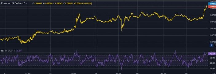 علاقة سعر اليورو مقابل الدولار (الخط الأصفر) مع المتوسط المتحرك الأسي (EMA، الخط الأزرق) ومؤشر القوة النسبية (أدناه، الخط الأرجواني) بين 14 و20 فبراير.