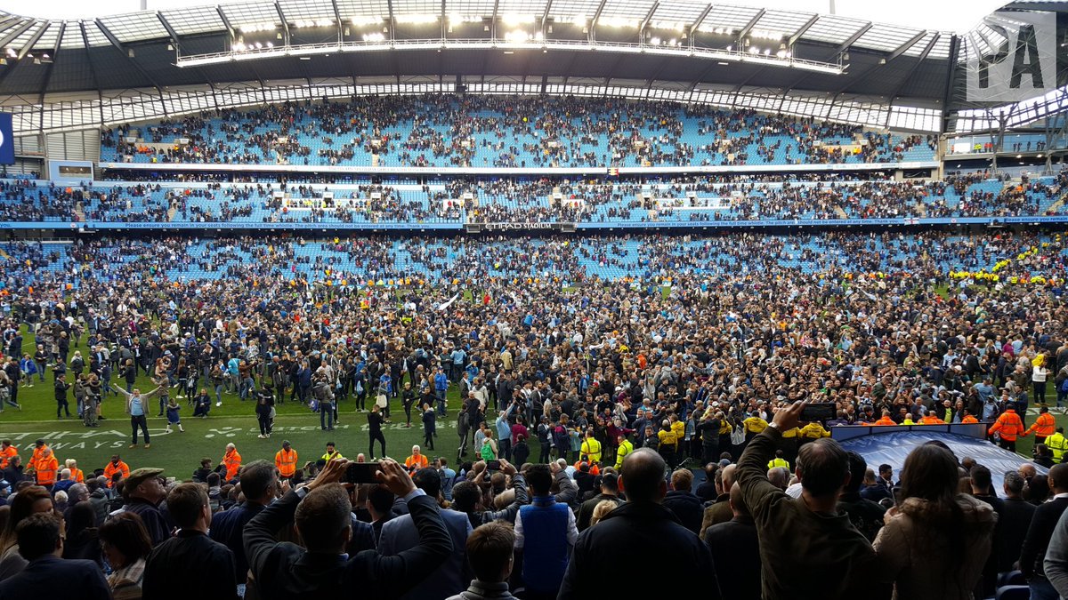 واقتحمت مشجعي السيتي عقب إطلاق صافرة النهاية ملعب الاتحاد للاحتفال مع اللاعبين باللقب الخامس للسيتيزنز علي مدار تاريخه .
