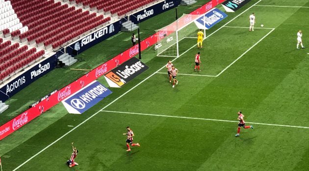 واستخلص يورينتي الكرة من ديميتريوس سيوفاس، لينطلق بالكرة من الناحية اليمنى، قبل أن يرسل الكرة زاحفة إلى كاراسكو، الخالي من الرقابة، الذي لم يجد أدنى صعوبة في إيداع الكرة داخل الشباك.