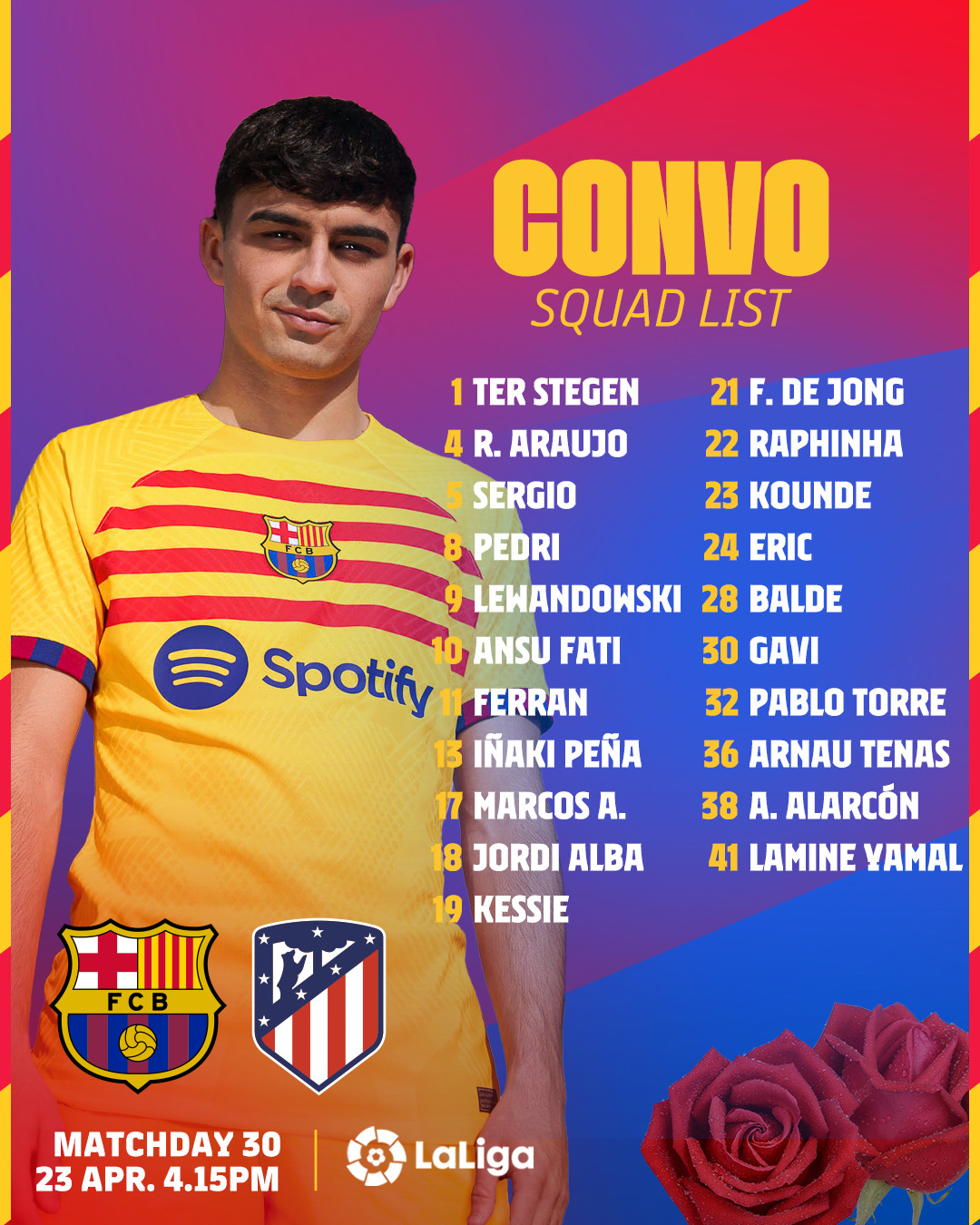 أعلن تشافي هيرنانديز، المدير الفني لنادي برشلونة، عن قائمة فريقه، استعدادا لمواجهة أتلتيكو مدريد، غدا الأحد على ملعب سبوتيفاي كامب نو، بقمة الجولة الـ30 من الدوري الإسباني.