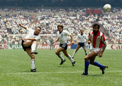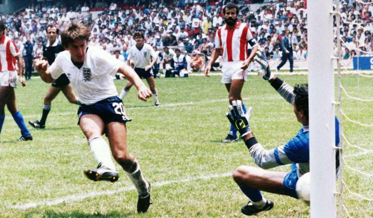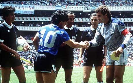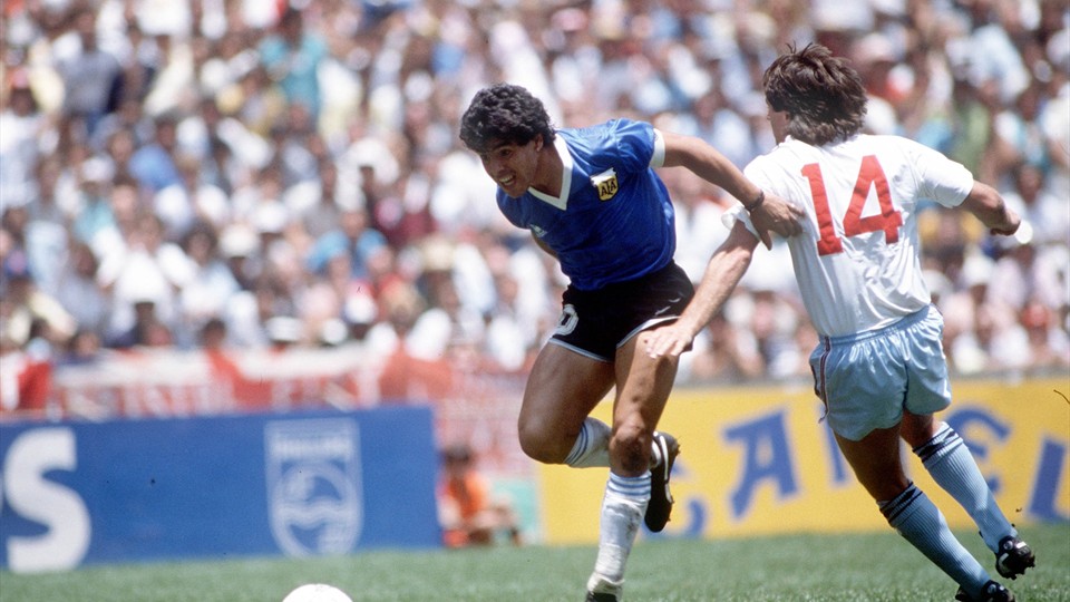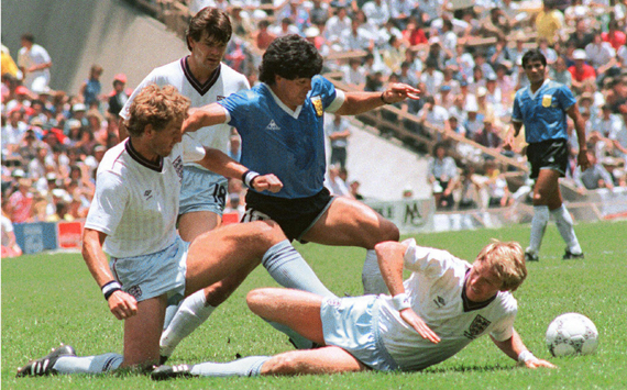 مارادونا أسطورة الكرة الأرجنتينية قدم واحدة من أفضل مباريات كأس العالم في التاريخ ، في ملعب "ازتيكا" بمكسيكو سيتي ، وأكثرها اثارة للجدل على الأطلاق ، حيث كان الهدف الأول المشهور بــ"يد الله" بعدما أرتقى مارادونا إلى الكرة بيده ليضعها في شباك الحارس بيتر شيلتون محرزاً أول اهداف راقصي التانجو في الدقيقة 51 .