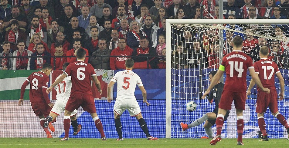 وأنهى ليفربول الشوط الأول متقدما بثلاثة أهداف نظيفة، حيث افتتح روبرتو فيرمينيو اهداف فريقه في الدقيقة الثانية، ليصبح أسرع أهداف ليفربول في البطولة على مدار تاريخه، وأسرع هدف سكن مرمى إشبيلية في البطولة، وأضاف ساديو ماني الهدف الثاني في الدقيقة 22 ثم أضاف فيرمينيو الهدف الثاني له والثالث لفريقه في الدقيقة 30.