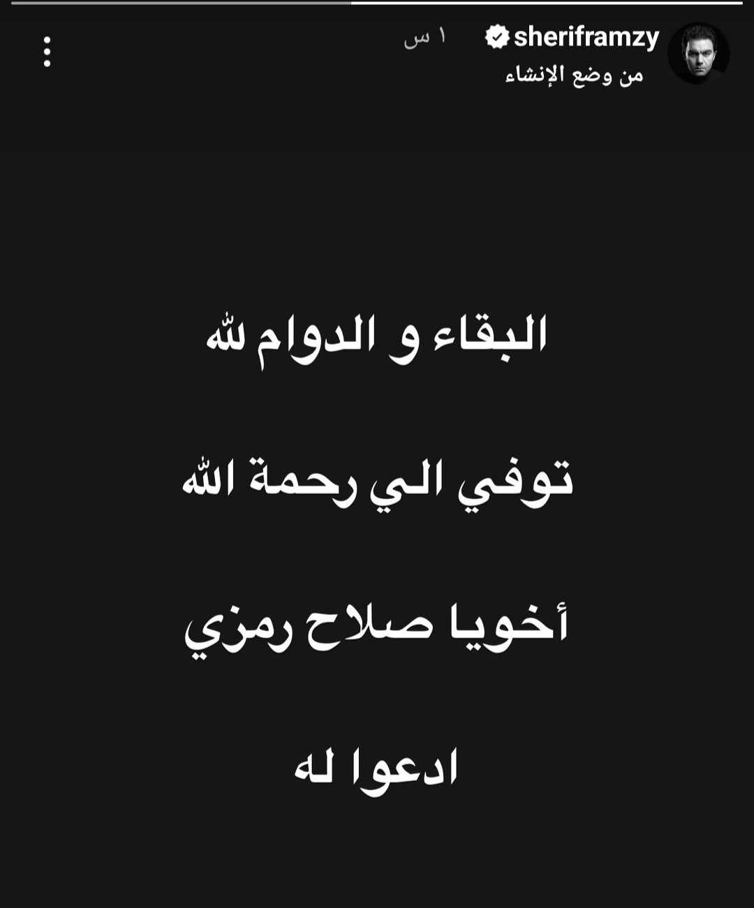 وقال شريف: «البقاء والدوام لله، توفي إلى رحمة الله أخويا صلاح رمزي، ادعوا له».