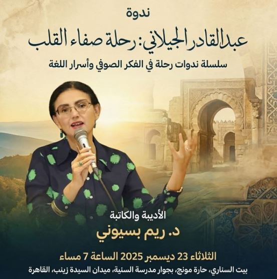 ينظم بيت السناري الأثري بحي السيدة زينب بالقاهرة، غدا الثلاثاء، ندوة للكاتبة الدكتورة ريم بسيوني، بعنوان "عبد القادر الجيلاني: رحلة صفاء القلب"، وذلك في تمام الساعة السابعة مساء.
