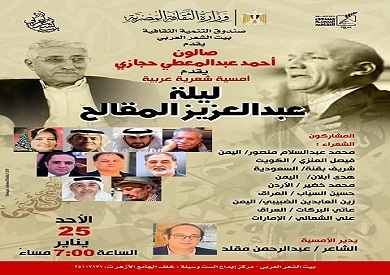تحمل الأمسية عنوان «ليلة عبدالعزيز المقالح»، وتأتي في إطار التقليد الخاص الذي يحرص عليه بيت الشعر لترسيخه فكرة تكريم رموز الشعر العربي.