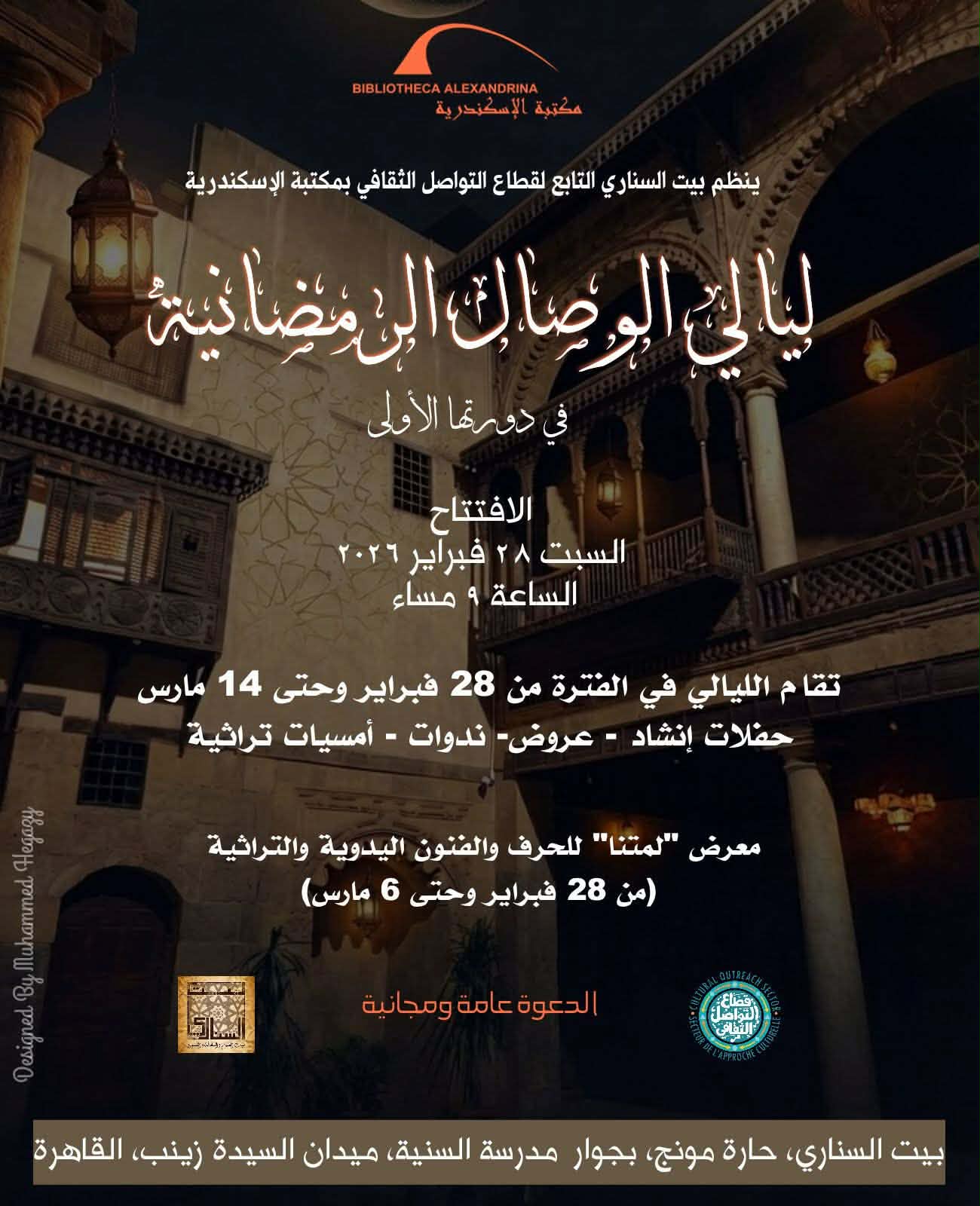 ينظم بيت السناري فعاليات «ليالي الوصال الرمضانية» في دورتها الأولى، وذلك يوم السبت الموافق 28 فبراير 2026، في تمام الساعة التاسعة مساءً، بمقر بيت السناري الأثري بحي السيدة زينب بالقاهرة.