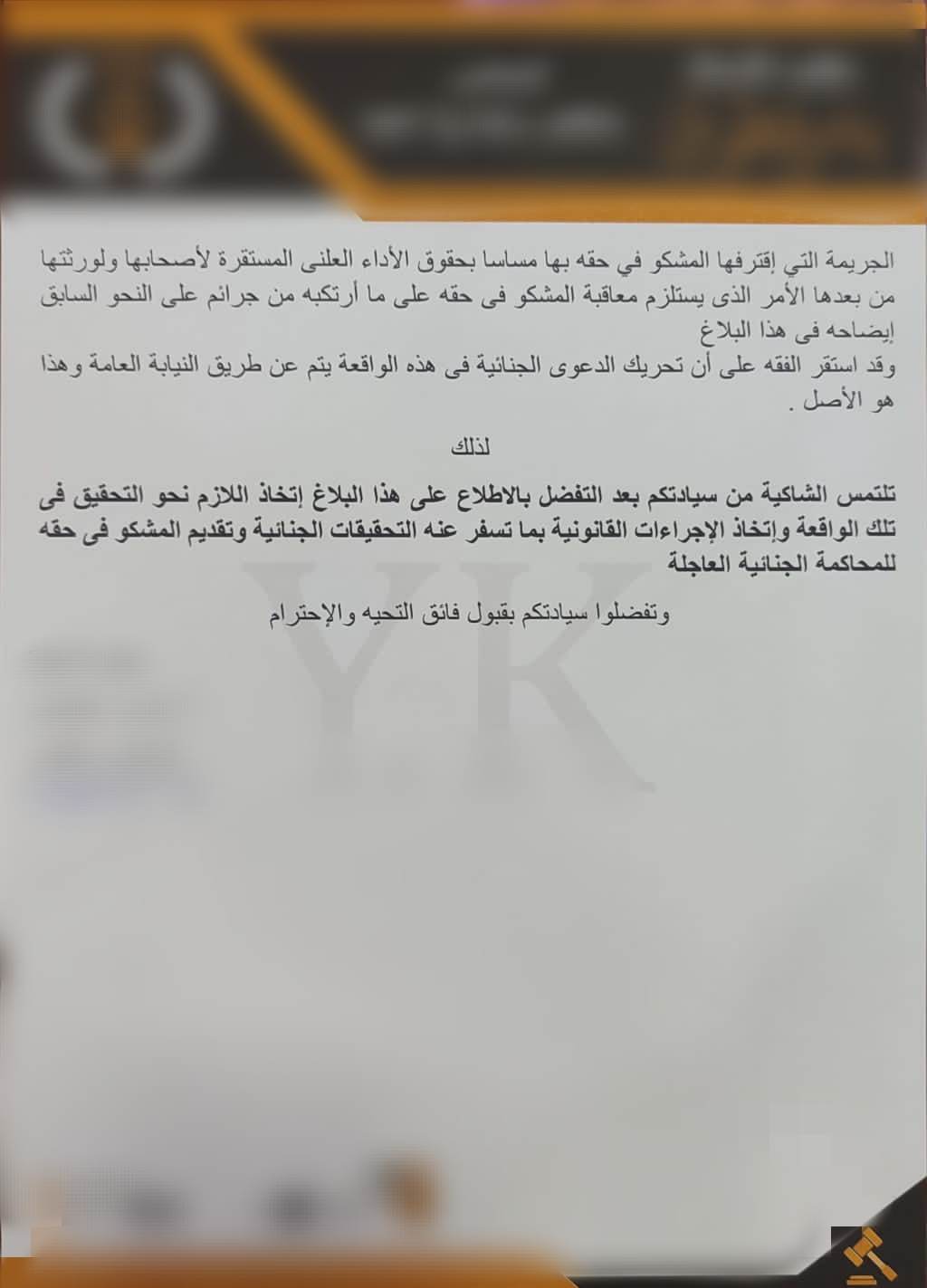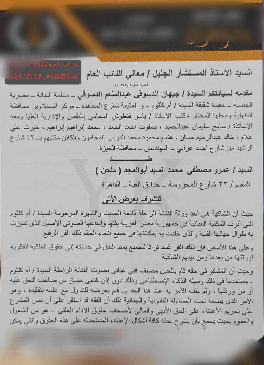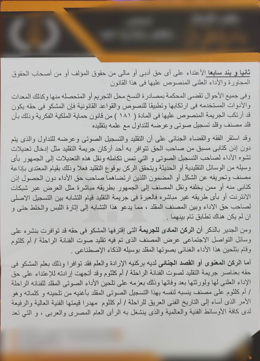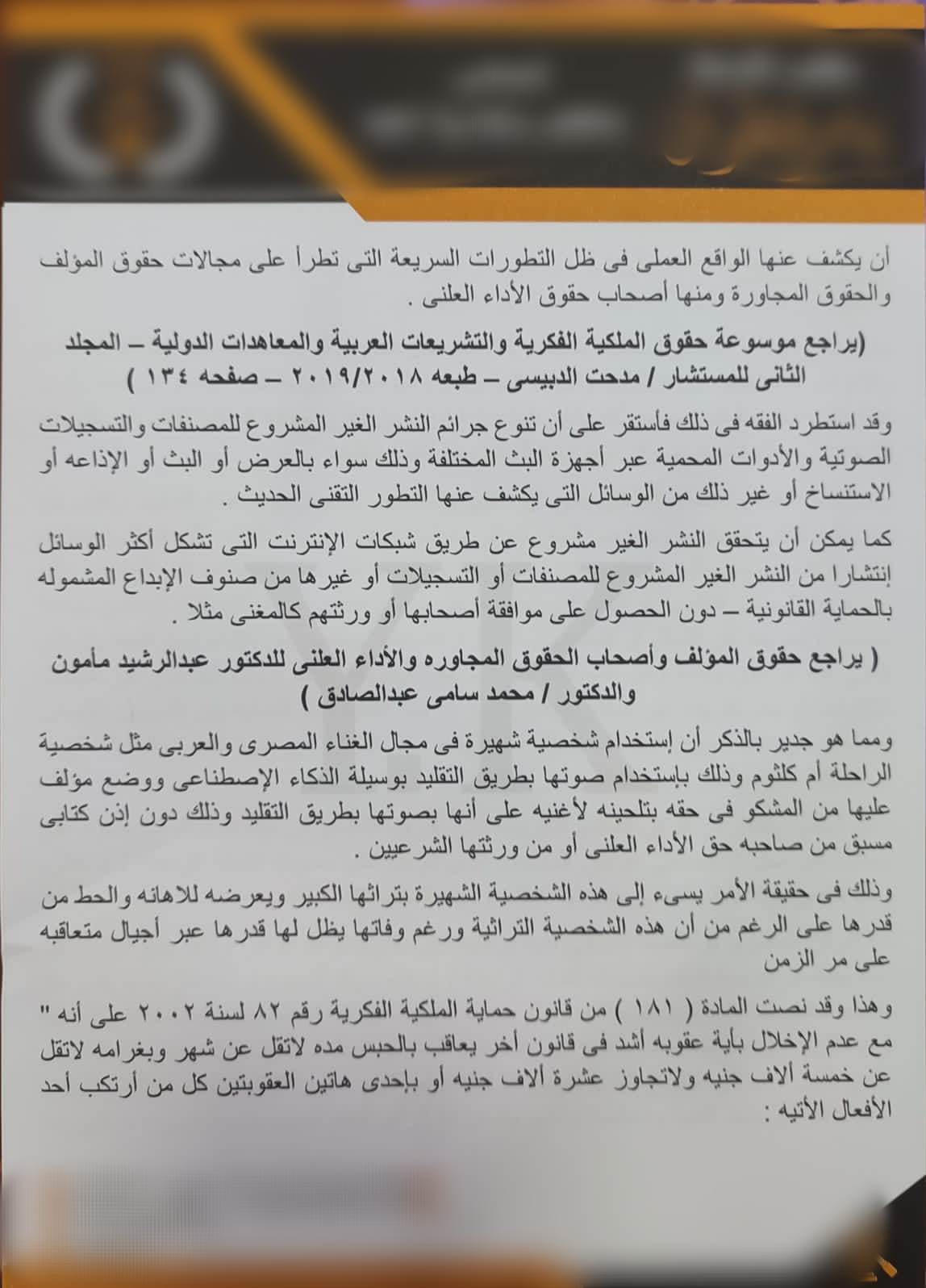 حمل البلاغ الذي تقدم به المستشار القانوني ياسر قنطوش محامي جيهان الدسوقي، رقم 29444 لسنة 2023 وجاء فيه، أن المشكو في حقه لم يحصل على إذن كتابي من ورثة كوكب الشرق لطرح هذا المصنف الغنائي، ولم يقف الأمر به عند هذا الحد بل عرضه للتداول مع علمه بتقليده، وهو الأمر الذي يضعه تحت المساءلة القانونية والجنائية، ذلك أن نص المشرع على تجريم الاعتداء على الحق الأدبي والمادي لأصحاب حقوق الأداء العلني، وهو من الشمول والعموم بحيث يسمح بأن يندرج تحته كل أشكال الاعتداء المستحدثه على هذه الحقوق والتي يمكن أن يكشف عنها الواقع العملي في ظل التطورات السريعة التي تطرأ على مجالات حقوق المؤلف والحقوق المجاورة ومنها أصحاب حقوق الأداء العلني.