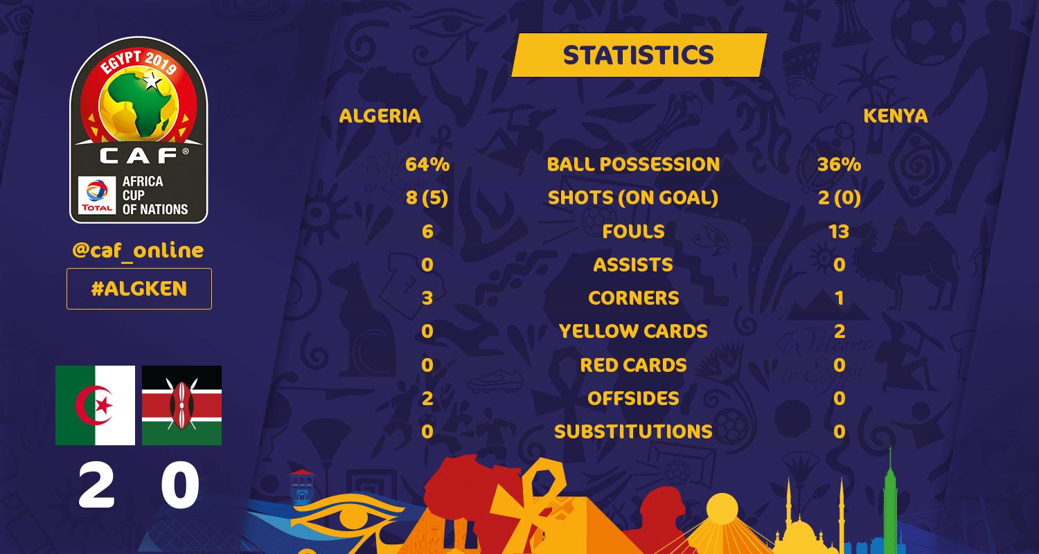 - الدقيقة 14 تسديدة من رياض محرز قائد منتخب الجزائر ولكن تصطدم بدفاع كينيا ويحول الكرة لركلة ركنية ثانية للجزائر
