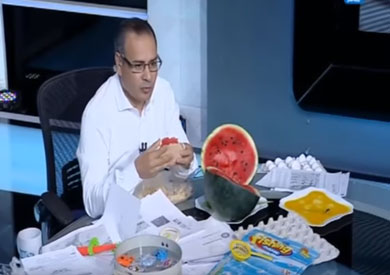 وتناول «القرموطي»، خلال تقديمه برنامج «مانشيت»، المذاع عبر فضائية «النهار»، أمس الأحد، خبز بالبطيخ، على الهواء، بعد كسره مجموعة من البيض، وتذوقه إياه من دون طهي، ساخرًا من شائعات «البيض البلاستيكي»، «البطيخ المسرطن»، «حقن الخبز بفيتامينات للحد من الكثافة السكانية».