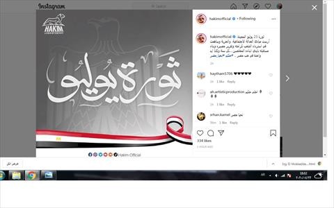 شارك المطرب الشعبي حكيم جمهوره المتابعين لحسابه الرسمي على "إنستجرام"، بصورة تحمل علم مصر تحت عنوان "ثورة 23 يوليو".