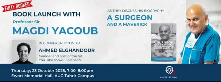 تشهد قاعة إيوارت التذكارية بحرم الجامعة الأمريكية في التحرير الآن احتفالية خاصة تنظمها دار نشر الجامعة الأمريكية بالقاهرة لإطلاق النسخة الورقية من السيرة الذاتية للبروفيسور السير مجدي يعقوب، بعنوان «جراح ومتمرد: حياة وأعمال مجدي يعقوب الرائدة»، وذلك بالتزامن مع احتفاله بعيد ميلاده التسعين.