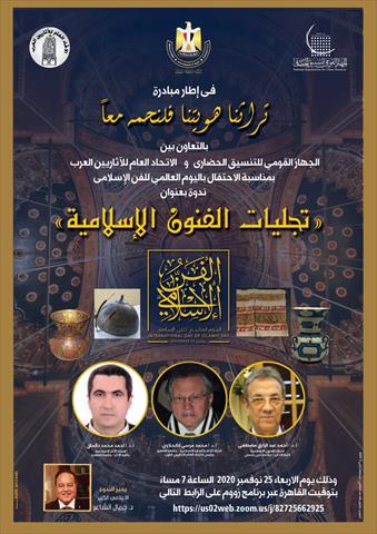 في إطار الاحتفال باليوم العالمي للفن الإسلامي ومبادرة "تراثنا هويتنا فلنحمه معا"، يعقد الجهاز القومي للتنسيق الحضاري برئاسة المهندس محمد أبو سعده، بالتعاون مع اتحاد الآثاريين العرب ندوة بعنوان "تجليات الفن الإسلامي"، وذلك في تمام السابعة من مساء الأربعاء المقبل 25 نوفمبر عبر برنامج زووم على رابط https://us02web.zoom.us/j/82725662925