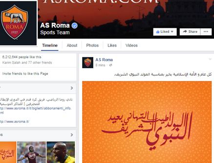 وجه نادي روما عبر صفحته الرسمية على موقع التواصل الإجتماعي "فيس بوك" تهنئة خاصة إلي الأمة الإسلامية بمناسبة المولد النبوي الشريف.