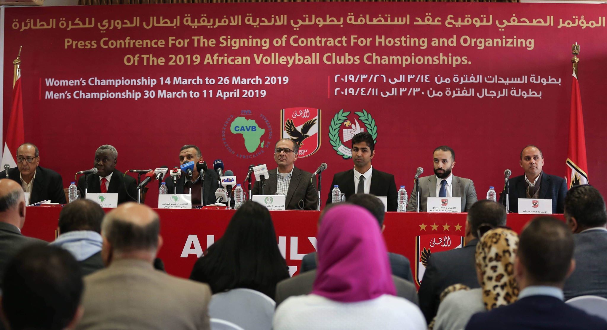 وتم توقيع عقود استضافة البطولتين في حضور مهند مجدي، عضو مجلس إدارة النادي ورئيس اللجنة المنظمة لبطولة الرجال، ومحمد سراج الدين عضو مجلس الإدارة ورئيس اللجنة المنظمة لبطولة السيدات، والعميد محمد مرجان المدير التنفيذي للنادي، ورؤوف عبدالقادر مدير عام النشاط الرياضي، والدكتور عمرو علواني، رئيس الاتحاد الإفريقي وجون كلود موتيبا نائب رئيس الاتحاد الإفريقي وهويدا مندي المدير التنفيذي للاتحاد الإفريقي، والمهندس خالد ناصف سليم رئيس الاتحاد المصري للكرة الطائرة، وهناء حمزة عضو مجلس الإدارة وأحمد عبدالدايم المدير التنفيذي للاتحاد.