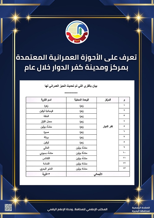 جدير بالذكر أنه سيتم تباعاً نشر باقى الأحوزة العمرانية بمختلف مدن ومراكز المحافظة على الصفحة الرسمية لمحافظة البحيرة، لتسهيل الاطلاع عليها من قبل المواطنين وتمكينهم من معرفة الحيز العمراني المعتمد لكل قرية وعزبة.