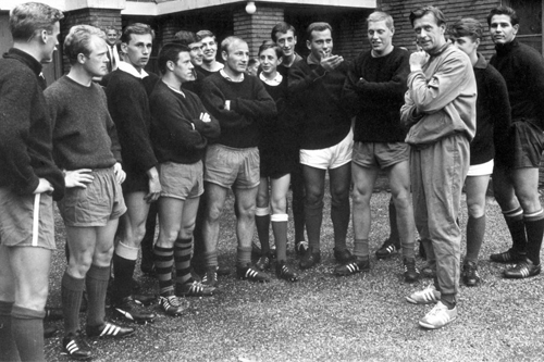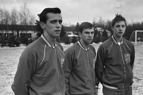 7- كرويف في أول تدريب له مع المنتخب الهولندي فى يناير 1966 ، ويظهر يوهان الأول على اليمين إلى جانب كلاً من ويلي دونيز وفان ديركولين .