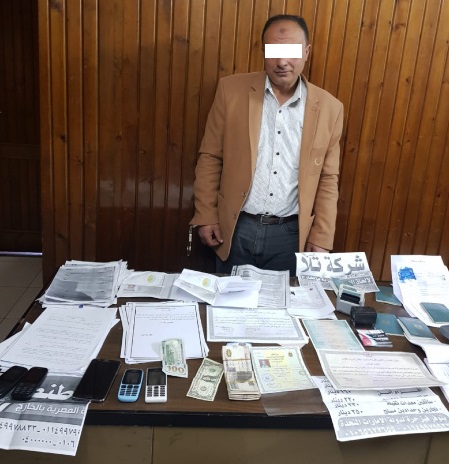 وبتقنين الإجراءات تم ضبطه وبتفتيش مقر الشركة تم ضبط " أكلاشيهات بأسماء شركات لإلحاق العمالة بالخارج وجوازات سفر بأسماء أشخاص مختلفة ،4 دفاتر إيصالات تحصيل النقدية، وكروت دعاية بإسم الشركة الملغى ترخيصها ودفاتر إستلام مبالغ من ضحاياه بإجمالى مبالغ 230 ألف جنيه، 5 هاتف محمول بفحصهم فنياً تبين أنهم محملين بالعديد من تأشيرات السفر وعقود عمل بأسماء شركات بالخارج ومحادثات تدل على نشاطه الإجرامي".