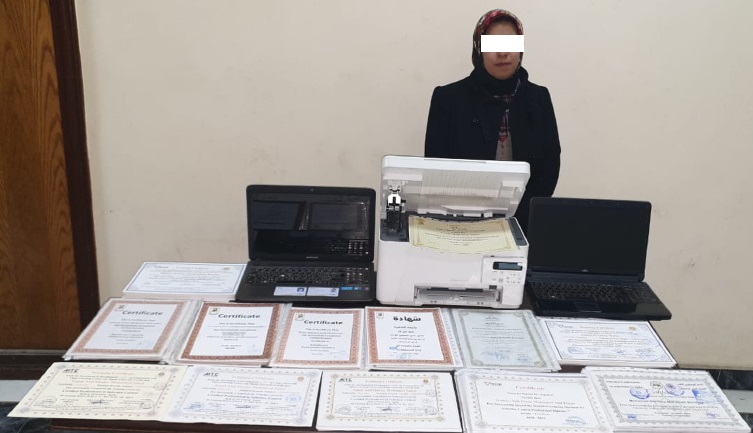 ورد بلاغ لفرع الإدارة العامة لمباحث الأموال العامة بغرب الدلتا من "هاني م." 39 عاما، صيدلي حر، بقيام "علياء ا." 30 عاما، صاحبة مركز تدريب واستثمارات، بتزوير شهادات دراسية لدورات تدريبية مختلفة ممهورة بخاتم شعار الجمهورية المقلد منسوب لجامعة حكومية، وبيعها لراغبي الحصول عليها مقابل مبالغ مالية، حيث تقوم بإيهامهم بكون تلك الشهادات صادرة من معاهد معتمدة.