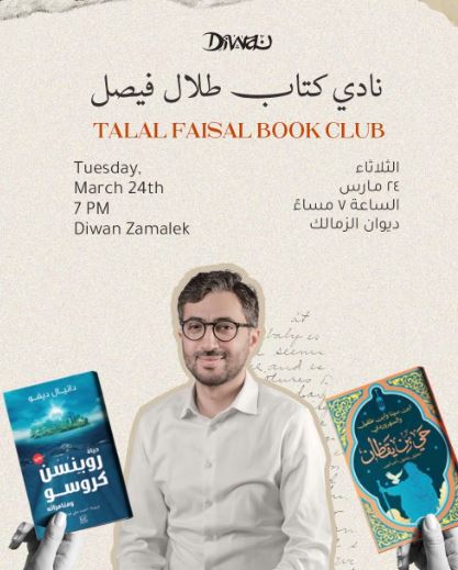 تستضيف مكتبة ديوان بمقرها في الزمالك، مساء اليوم الثلاثاء 24 مارس، لقاءً جديدًا لنادي كتاب الكاتب "طلال فيصل"، وذلك في تمام الساعة السابعة مساءً.