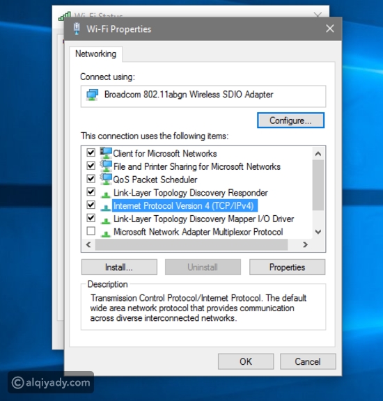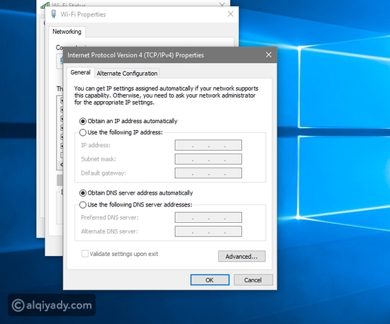 ثم خصائص، وقم بتغيير اعدادات DNS من الوضع التلقائي الى الوضع اليدوي ومن ثم أدخل رمزي ال DNS المفضّل. إضغط موافق ثم أعد تشغيل المتصفح.