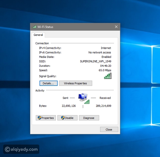 ومن ثم اختر الشبكات و مركز المشاركة، اضغط على اسم الشبكة اللاسلكية المتصلة لتظهر نافذه أخرى