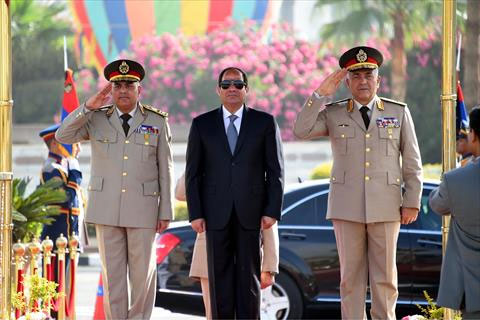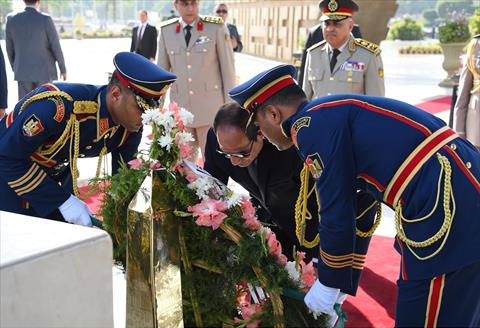 رافق الرئيس في مراسم وضع إكليل الزهور كل من الفريق أول صدقي صبحي وزير الدفاع والإنتاج الحربي، والفريق محمود حجازى رئيس أركان حرب القوات المسلحة.