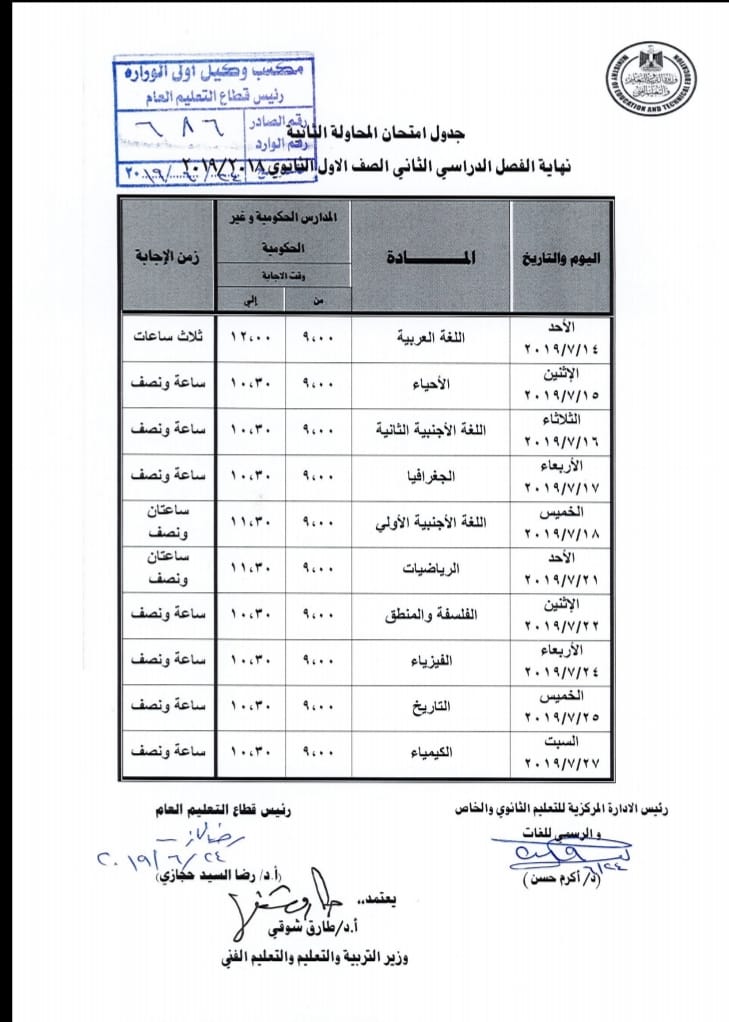 اعتمد وزير التربية والتعليم، اليوم، جدول امتحانات شهر يوليو للصف الأول الثانوي (الدور الثاني) للعام الدراسي الحالي 2018/2019