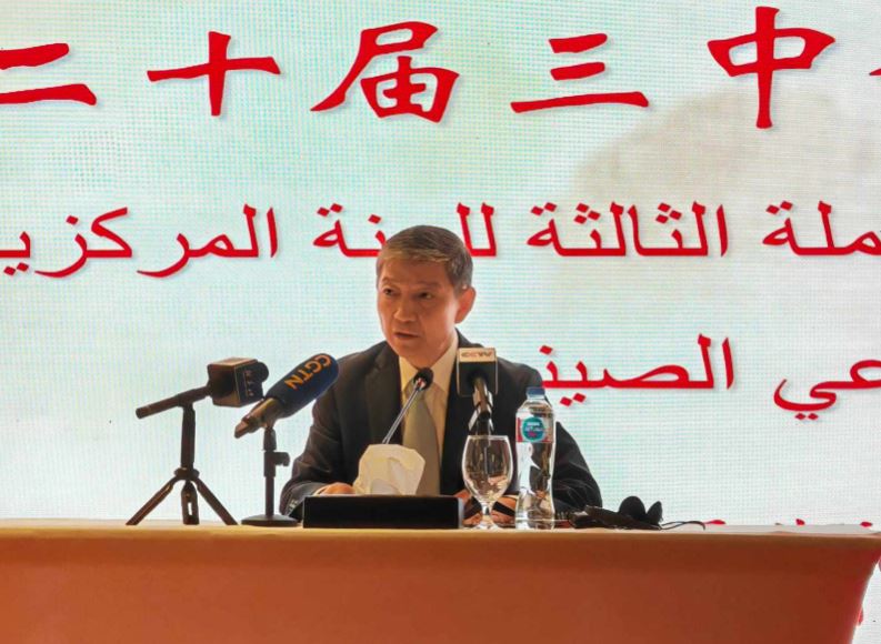 وأشار السفير الصيني إلى انعقاد الجلسة الكاملة الثالثة للجنة المركزية الـ20 للحزب الشيوعي الصيني في بكين يومي 15 و18 يوليو، موضحا أنها اجتماع مهم ولافت في الوقت الذي يعتزم الحزب الشيوعي الصيني مواصلة الإصلاح والانفتاح وتحقيق التحديث الصيني النمط من خلال تعميق الإصلاح على نحو شامل.