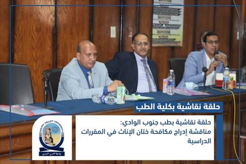 أقيمت بجامعة جنوب الوادي، اليوم الثلاثاء، حلقة نقاشية عن إدراج مقرر يتناول مكافحة ختان الإناث في المقررات الدراسية بكلية الطب، بحضور الدكتور أحمد كمال نصاري نائب رئيس الجامعة لشؤون خدمة المجتمع وتنمية البيئة، والدكتور علي عبدالرحمن غويل عميد كلية الطب، والدكتورة نادية عبدالله عميد كلية التمريض، والدكتور عيسى محمد حجازي عميد المعهد الفني الصحي.