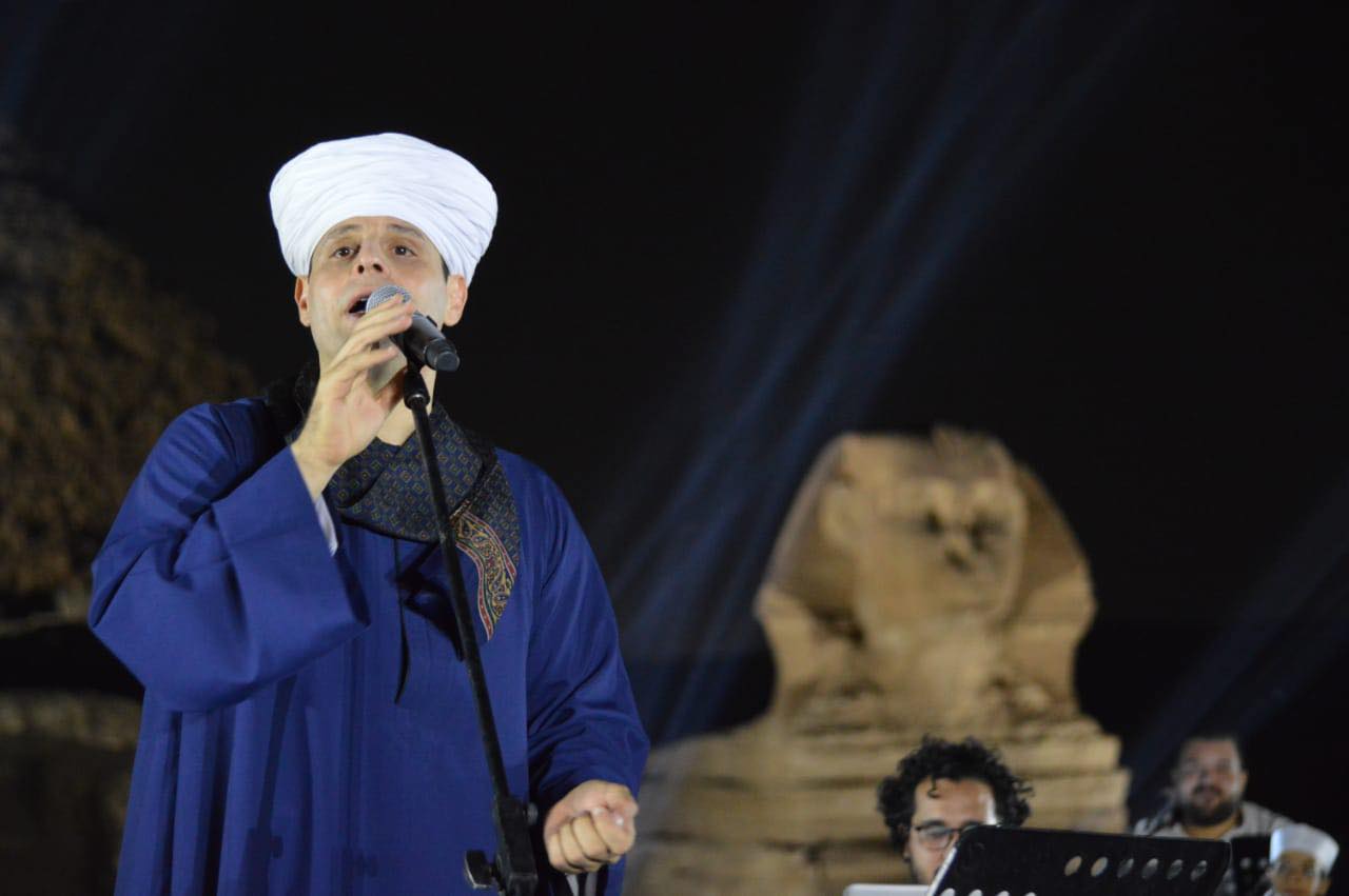 أشعل المنشد محمود التهامي، أجواء منطقة الأهرامات الأثرية، بسهرة إنشاد ديني هي الأولى من نوعها في سفح الهرم، ورفعت لافتة كامل العدد.