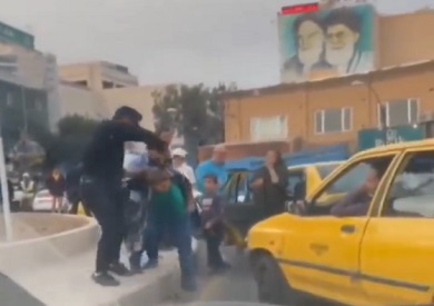 وأظهر الفيديو، اثنين من عناصر الحرس الثوري وهما يعتديان على امرأة، بإمساكها بعنف من يديها، وقام أحدهما بشدها من شعرها وجرها وسط الشارع، ثم استلمها منهما، زميلهما الذي قادها نحو إحدى السيارات للقبض عليها.