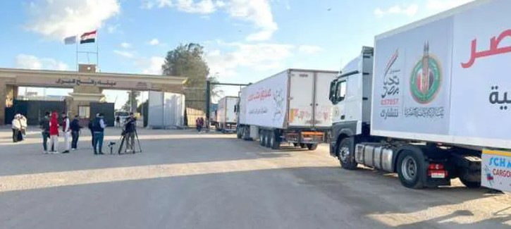 أفادت فضائية «القاهرة الإخبارية»، بأن مصر سلمت الجانب الفلسطيني حتى أمس الخميس، 2357 طنًا من الأدوية والمستلزمات الطبية، و7328 طنًا من المواد الغذائية، و528 طنًا من الوقود.