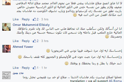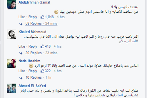 وناشد احد الجماهير صلاح بضرورة تطوير اداءه الدفاعى ، وكذلك الدخول فى التحامات مع الخصم لكسب الكرة ، وهو مايفتقده صلاح فى الوقت الحالى حسب اراء الجماهير .