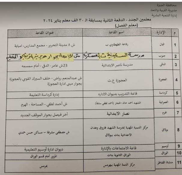 وكشفت المديريات، عن تحديد أماكن التدريب للمعلمين الجدد وفقا للمربع السكني بكل إدارة تعليمية كما هو مدون ببطاقة الرقم القومي.