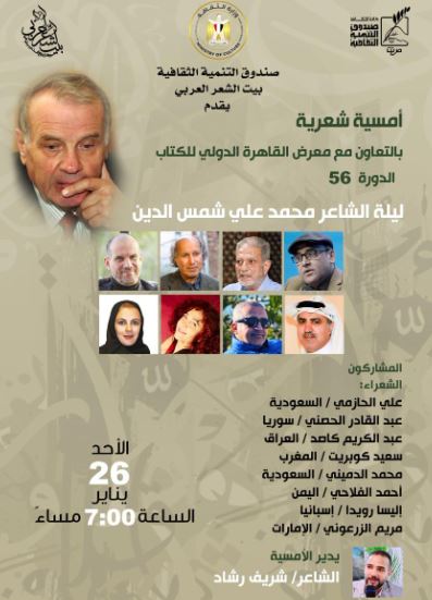 ينظم بيت الشعر العربي "مركز إبداع الست وسيلة" -خلف الجامع الأزهر- التابع لقطاع صندوق التنمية الثقافية، وبمناسبة افتتاح معرض القاهرة الدولي للكتاب في دورته الـ٥٦، أمسية شعرية حول الشاعر الراحل "محمد علي شمس الدين" وذلك في السابعة من مساء غد الأحد، وذلك في إطار تكريم وزارة الثقافة المصرية لرواد الفن والأدب العربي.