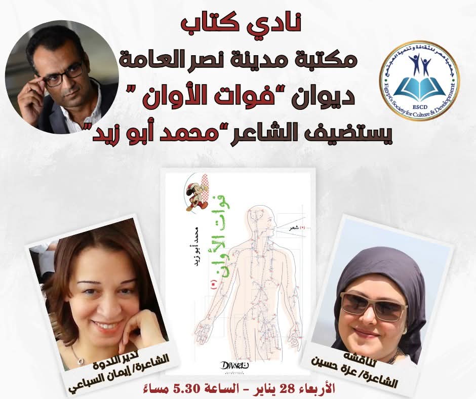 ينظم نادي كتاب مكتبة مدينة نصر العامة، التابع لجمعية مصر للثقافة وتنمية المجتمع، مناقشة ديوان "فوات الأوان" للشاعر والروائي محمد أبو زيد، وذلك يوم الأربعاء المقبل، في تمام الساعة الخامسة والنصف مساءً بمقر المكتبة.