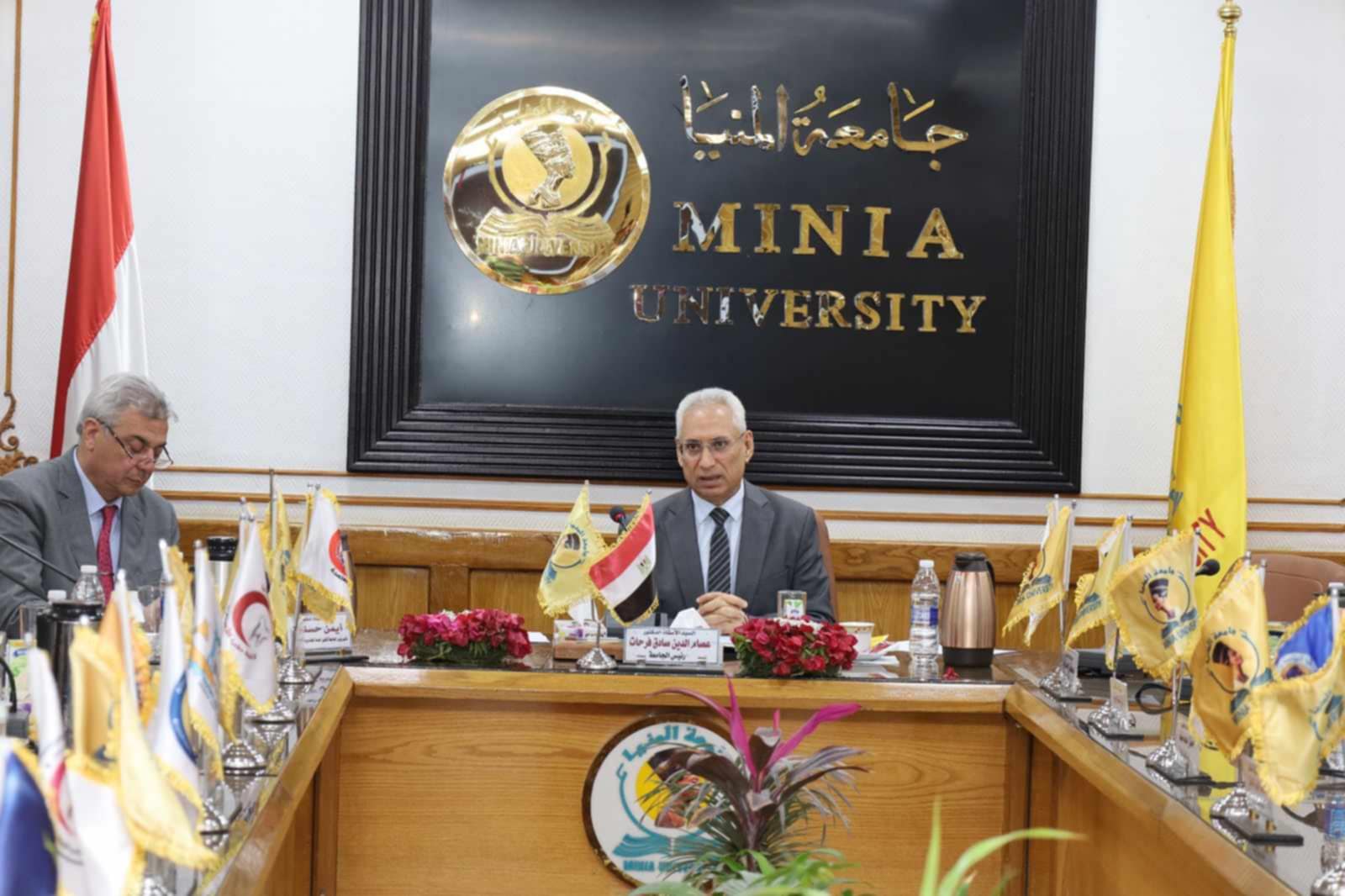 عقد مجلس جامعة المنيا اجتماعه الدوري، برئاسة الدكتور عصام فرحات، رئيس الجامعة، وبحضور اللواء عماد كدواني، محافظ المنيا، والدكتور أيمن حسنين، نائب رئيس الجامعة لشئون خدمة المجتمع وتنمية البيئة، إلى جانب عمداء الكليات، والمستشار القانوني للجامعة، والمدير التنفيذي للمعلومات، وأمين عام الجامعة، ورئيس اتحاد الطلاب، لمناقشة عدد من القضايا التعليمية والبحثية والتنموية.
