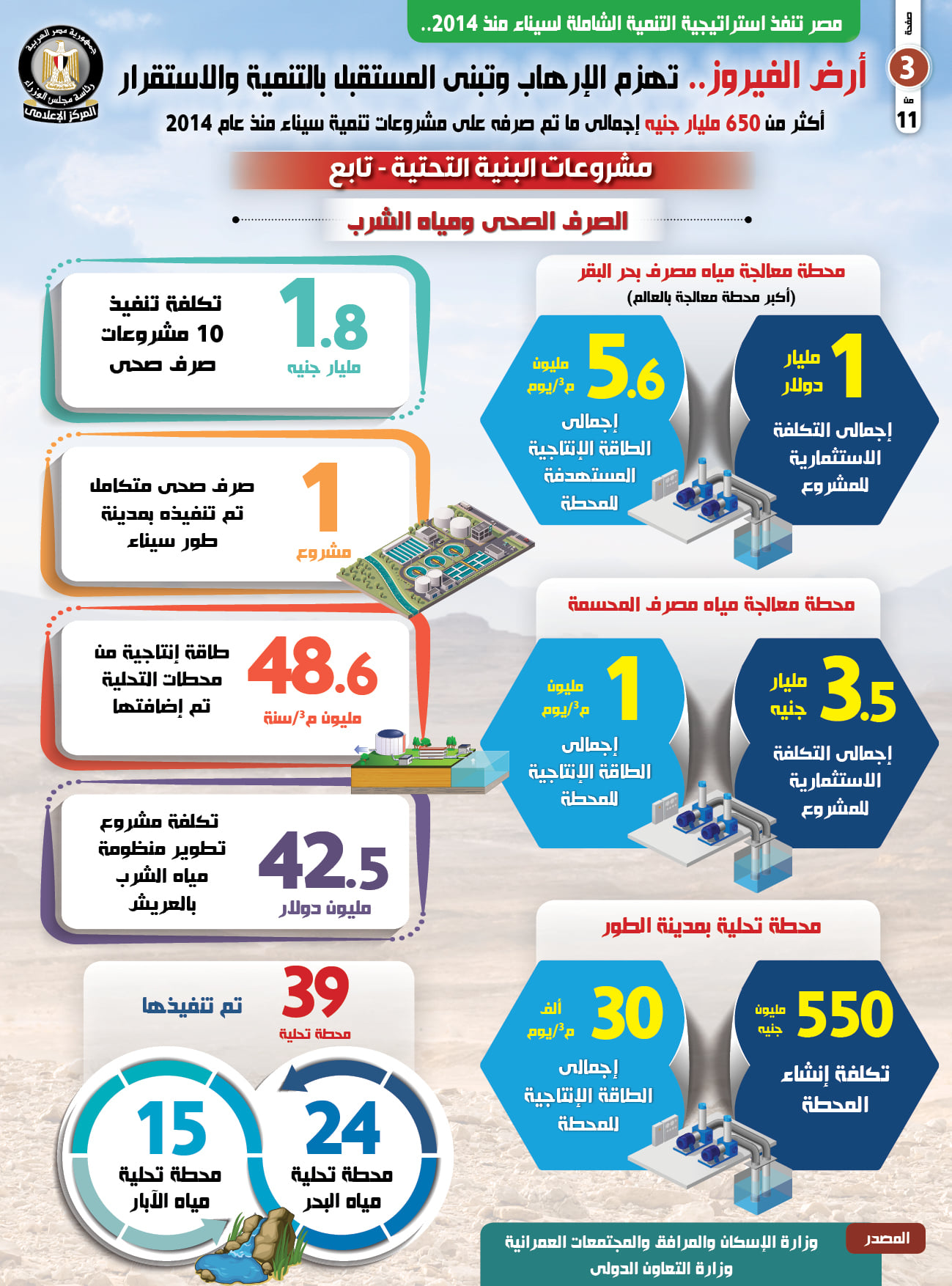 هذا وقد بلغت تكلفة تنفيذ 10 مشروعات صرف صحي بسيناء 1.8 مليار جنيه، في حين تم تنفيذ مشروع صرف صحي متكامل بمدينة طور سيناء، وإضافة 48.6 مليون م3/سنة طاقة إنتاجية من محطات التحلية بسيناء.