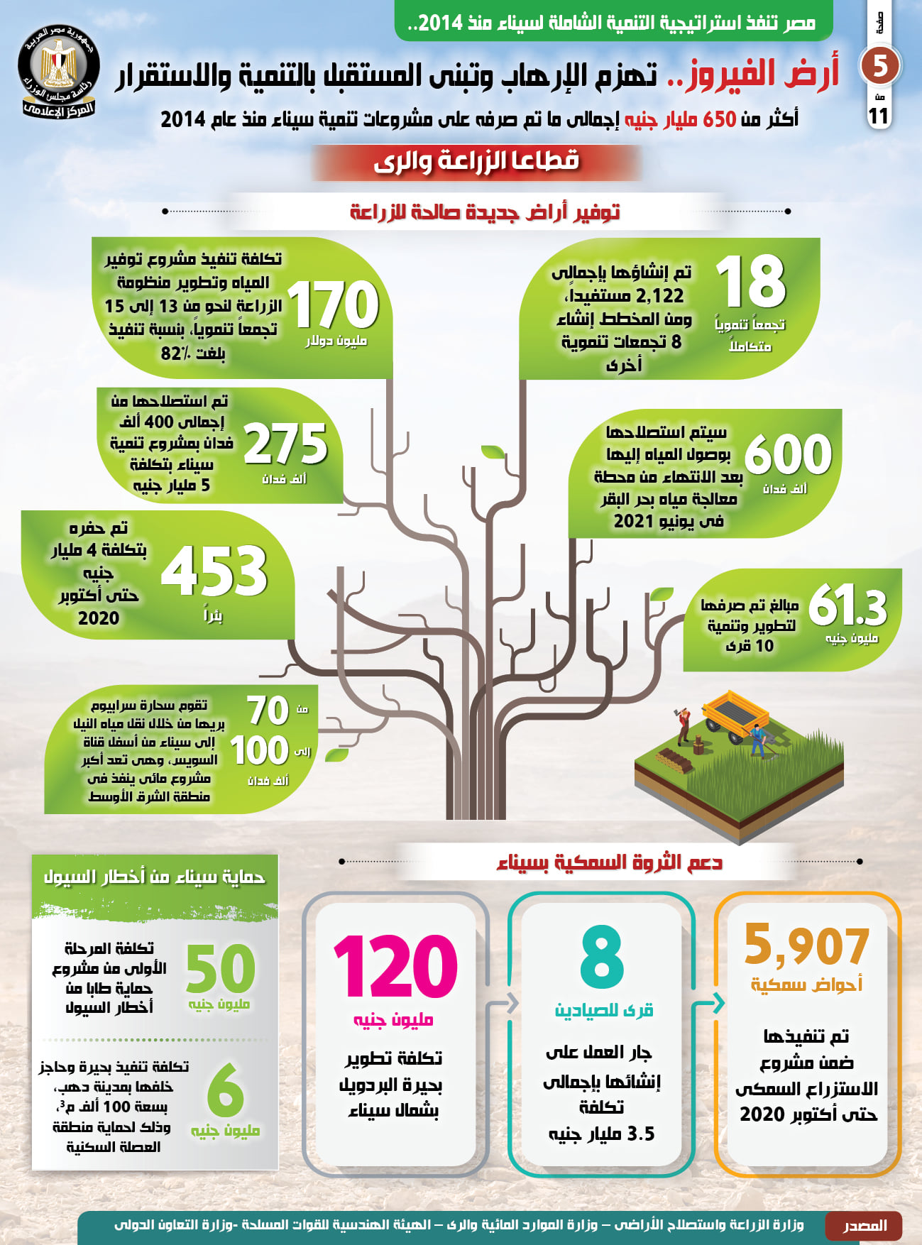 وفي سياق متصل، تم استصلاح 275 ألف فدان من إجمالي 400 ألف فدان بمشروع تنمية سيناء بتكلفة 5 مليار جنيه، بينما من المقرر أن يتم استصلاح 600 ألف فدان بوصول المياه إليها بعد الانتهاء من محطة معالجة مياه بحر البقر في يونيو 2021، فضلاً عن أنه سيتم استزراع ما بين 70 إلى 100 ألف فدان وريها عبر سحارة سرابيوم، من خلال نقل مياه النيل إلى سيناء من أسفل قناة السويس، وهي تعد أكبر مشروع مائي ينفذ في منطقة الشرق الأوسط.