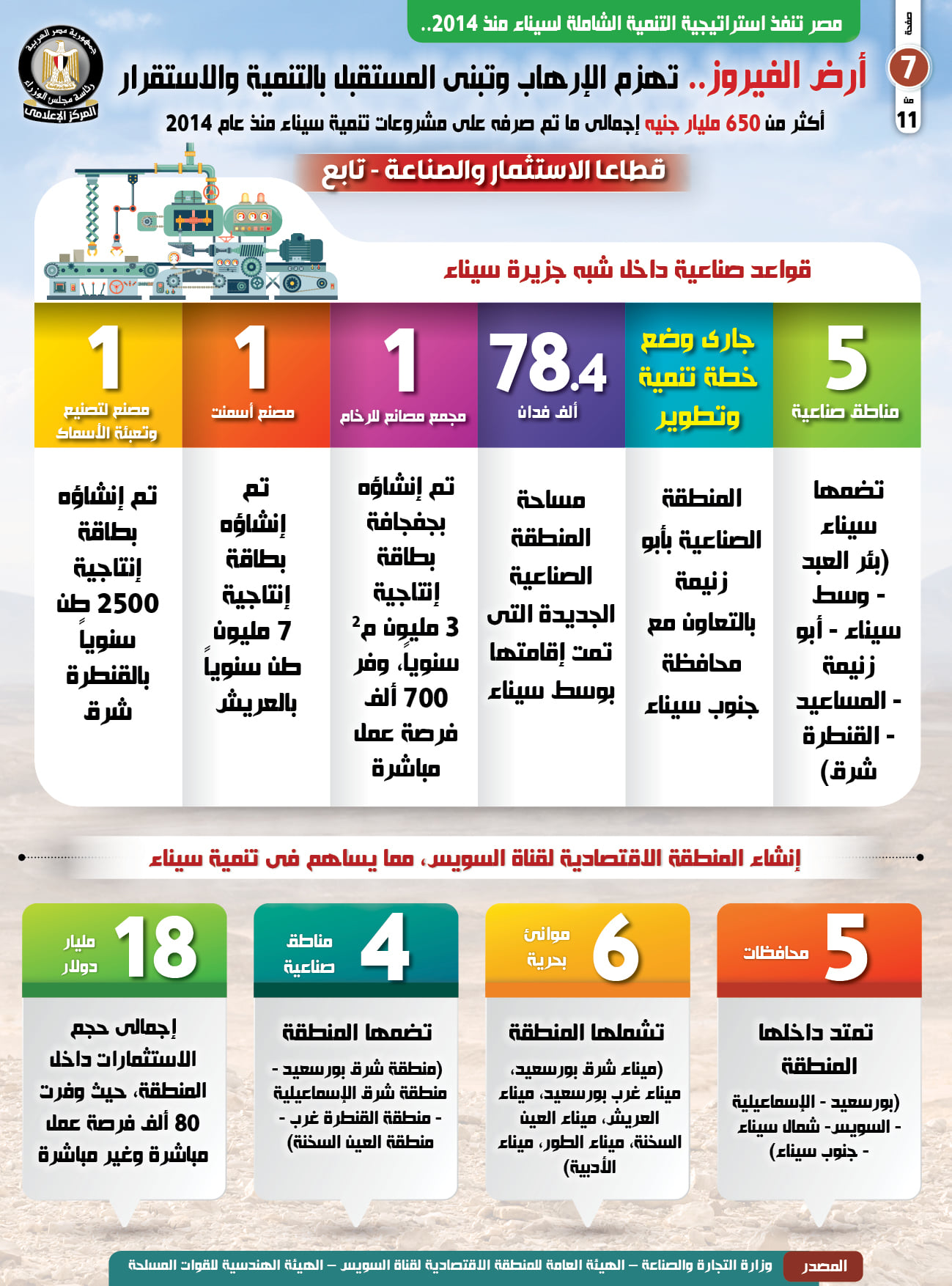 وفي هذا الصدد، نشر المركز الإعلامي لمجلس الوزراء، تقريراً تضمن إنفوجرافات تسلط الضوء على حرص الحكومة على الاستمرار في تنفيذ استراتيجية التنمية الشاملة لسيناء منذ عام 2014.
