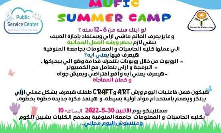 تنظم كلية الحاسبات والمعلومات جامعة المنوفية، ورشة عمل مجانية للأطفال من 6 إلى 12 سنة "MUFIC SAMMER CAMP"، يوم الاثنين المقبل 30 مايو الجاري، بكلية الحاسبات والمعلومات بمجمع الكليات بشبين الكوم.