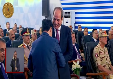 ووقف الرئيس السيسي وسلم على الشاب، كما التقطت صورة لهما ضمن فعاليات الافتتاح.