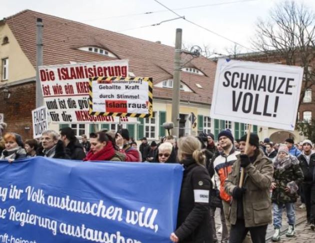 وبدا الشبان وهم يغنون بلا خجل وبلا اكتراث تماما عبارة "ألمانيا للألمان – اخرجوا أيها الأجانب"، وقام أحد الرجال بأداء حركة تُذَكِّر بالتحية الخاصة بالزعيم النازي الراحل أدولف هتلر فيما بدا أن أحدا من المحطيين لم يبد انزعاجا حيال ما حدث.
