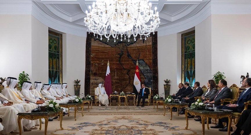 وفيما يتعلق بمستجدات القضية الفلسطينية، أشاد الأمير القطري بالجهود المصرية القائمة لإعادة إعمار قطاع غزة، كما توافقت الرؤى بشأن أهمية العمل على إحياء عملية السلام للتوصل إلى حل عادل وشامل للقضية الفلسطينية، بما يضمن الحقوق المشروعة للشعب الفلسطيني الشقيق وفق مرجعيات الشرعية الدولية.